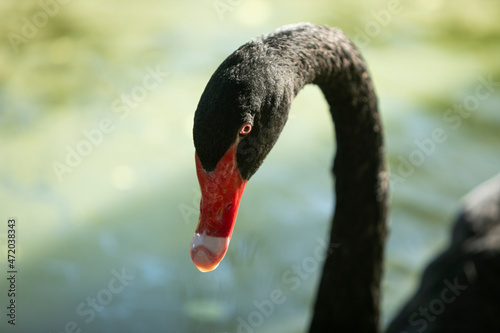 © somrerk, Fototapeta premium close-up of black swan's head with bright red mouth