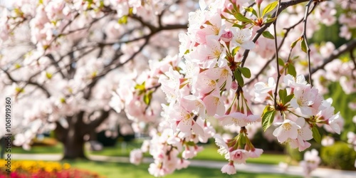Fototapeta premium Close up of blooming cherry blossoms in a park during spring season, sunny,...