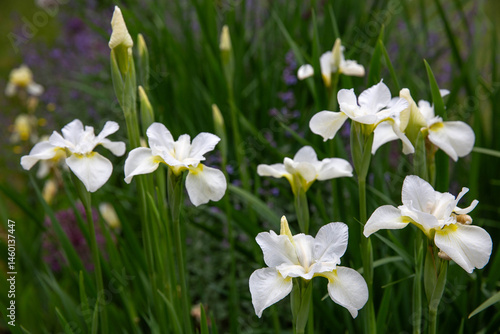 © Olga Ionina, Fototapeta premium Close-up of blooming white Siberian iris Gull's Wing in natural garden setting. Elegant white flowers irises with soft yellow centers perfect for floral backgrounds, plant guides, or garden promotions