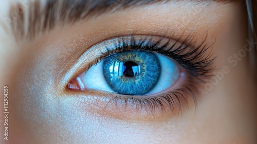 Obraz premium Close-up of blue eye with intense detail, vibrant colors in iris, beautiful human eye with realistic eyelashes, captivating eye anatomy and vision