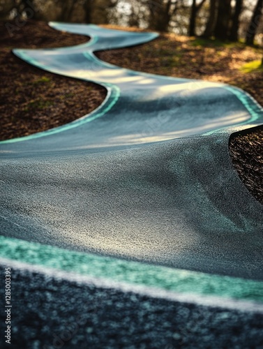 © Margarita, Fototapeta premium Close Up of BMX Pump Track Featuring Winding Asphalt Ramps and Green Markings in Summer