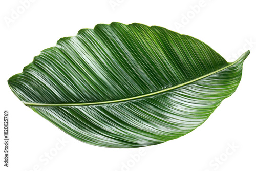 © SaroStock, Naklejka premium Close-up of bright green Calathea lutea leaf shows distinct veins and texture on a white background