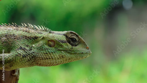 Obraz premium Close-up of bright green chameleon head isolated on blurred background