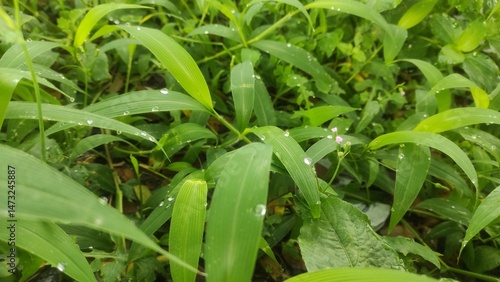 © Al-Jabbar99, Obraz premium Close-up of bright green grass with morning dew drops.