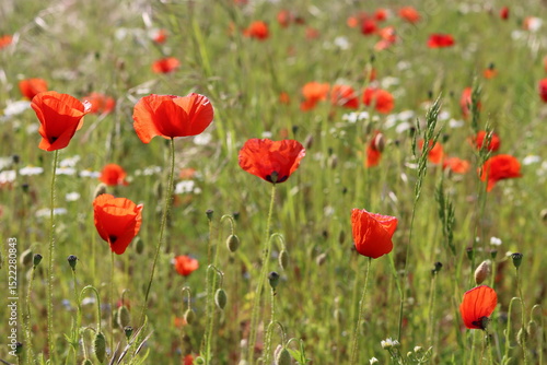 © Francesca Leslie, Fototapeta premium Close up of bright red poppies in a meadow
