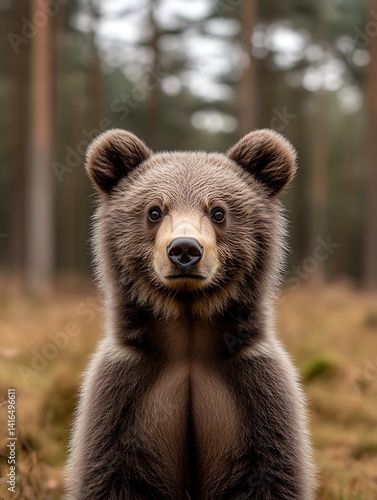 Fototapeta premium Close-up of Brown Bear Cub in Forest Seeking Connection