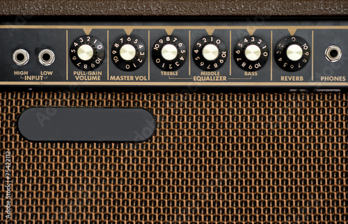 © Jirawatfoto, Fototapeta premium Close up of brown electric guitar amplifier