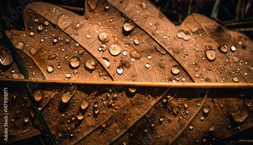© mfahryf, Fototapeta premium Close Up Of Brown Fallen Leaf With Water Droplets On Surface