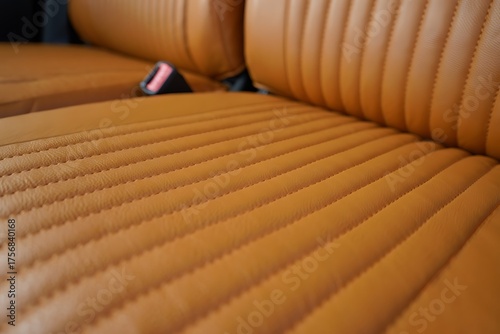 © Sirat Mahmood, Obraz premium Close up of brown ribbed leather car seat upholstery with seatbelt