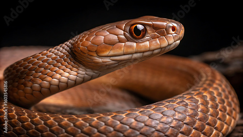Fototapeta premium Close-Up of Brown Snake with Amber Eyes on Dark Background