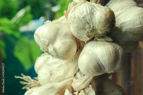 Obraz premium Close up of bunch of white garlic (Allium sativum. Harvest time.) drying on...