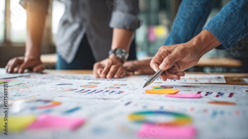 © Sampao, Fototapeta premium Close-up of business pitch deck slides and company growth strategy handouts