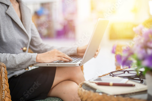 © nikomsolftwaer, Naklejka premium Close up of business woman hands typing on laptop computer in the office.