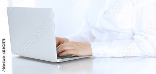 Fototapeta premium Close-up of business woman hands typing on laptop computer. Secretary at work...