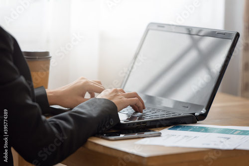© surachetkhamsuk, Fototapeta premium Close up of businesswoman hands typing in a laptop in the office