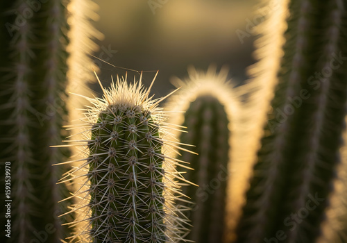 Obraz premium Close-up of cacti with sharp spines illuminated by soft sunlight, creating a...
