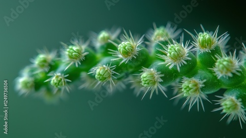 © Dece Std, Obraz premium Close-up of cactus branch with buds, blurred green background