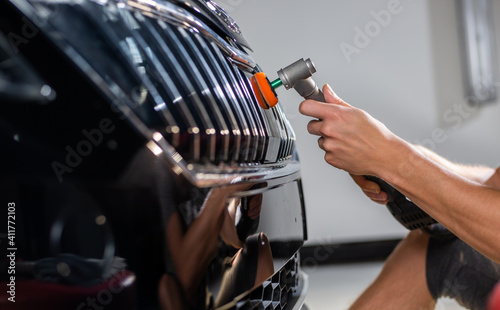 Obraz premium Close up of car detailist hands, cleaning or pilishing the car by poliermaschine, car detailing concept
