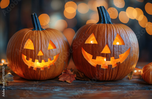 © Imane, Obraz premium close up of carved halloween pumpkins on table