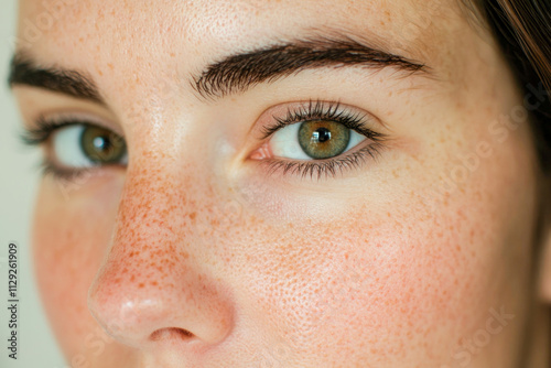 Fototapeta premium Close-up of caucasian female's freckled face with green eyes