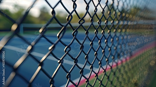 Fototapeta premium Close up of chain wire fence surrounding a tennis court