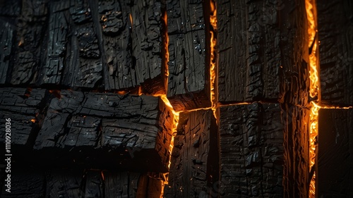 © borispain69, Obraz premium Close-up of charred wood, glowing embers, intricate cracks and textures