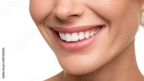 © Thidaphon, Obraz premium Close-up of cheerful woman showing radiant smile, healthy skin tone, natural lighting, isolated on seamless white background, ideal for dental or wellness advertising