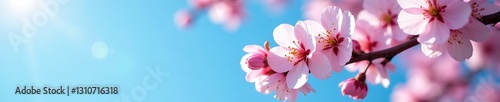 Fototapeta premium Close-up of cherry blossom tree branches against blue sky, trees, vibrant,...
