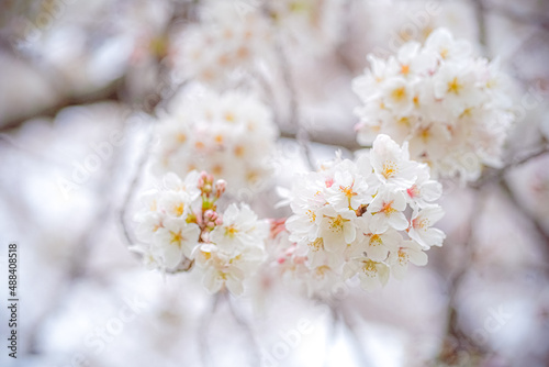 © hakofac, Obraz premium 下から見上げた満開の桜のアップ/Close-up of cherry blossoms in full bloom, viewed from below