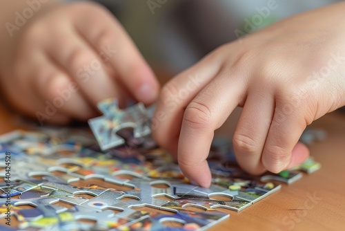 © Tasnim, Fototapeta premium Close-up of child's hands assembling a jigsaw puzzle. Indoor photography focused on detail. Leisure and development concept for design and print.
