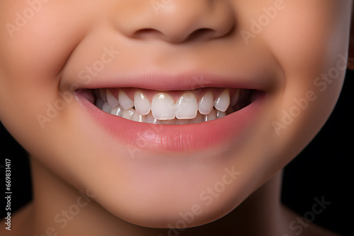 Obraz premium Close up of child's smiling mouth with white teeth