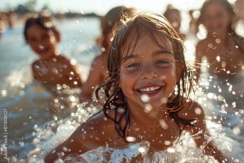 Obraz premium Close-up of children playing and splashing in the water at the beach Their laughter and excitement are captured as the water sparkles in the sunlight The natural beauty of the ocean and the carefree