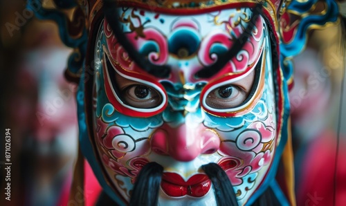 © Nadin Faust, Naklejka premium close-up of chinese peking opera mask with symmetrical composition and vibrant colors, intricate patterns, traditional costume details, blurred background of alleyway celebrating dragon boat festival