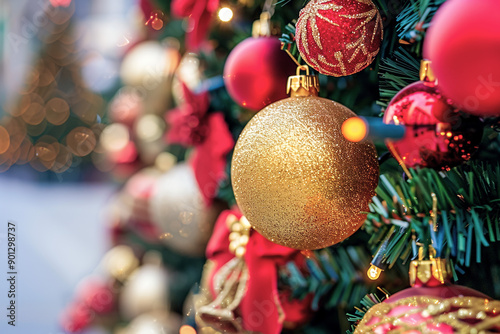 Fototapeta premium Close-up of Christmas ornaments on a decorated tree with lights.