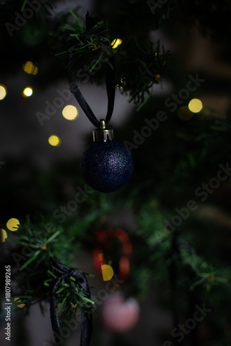Naklejka premium close up of Christmas ornaments on a green christmas tree, sparkly textured...