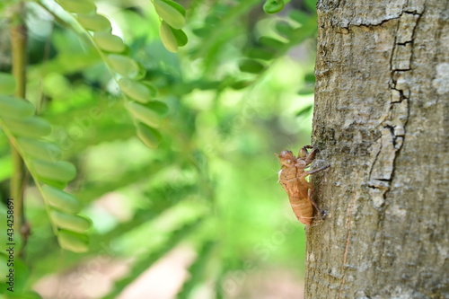 © masterjew, Obraz premium Close up of Cicada molting on the tree with nature background in the garden at Thailand.