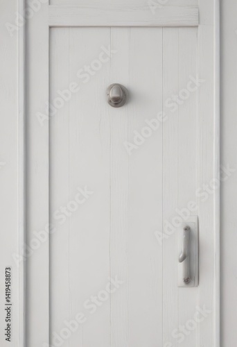 © Kachaphot, Fototapeta premium Close-up of closed white wooden door, minimalist handle , interior design, house