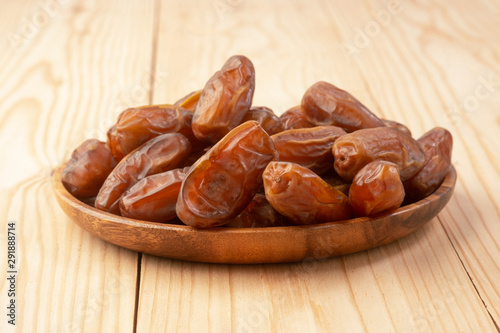 © suthisak, Obraz premium Close up of cluster dates plam. Fresh dates plam on wooden table.