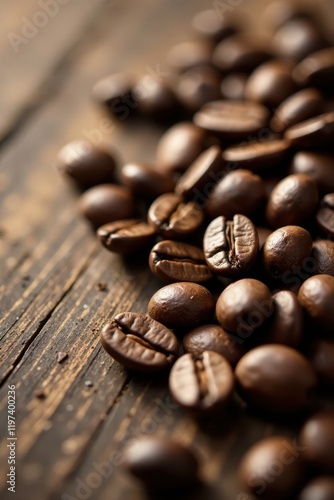 Naklejka premium Close-up of coffee beans on aged wooden board , close-up, backdrop