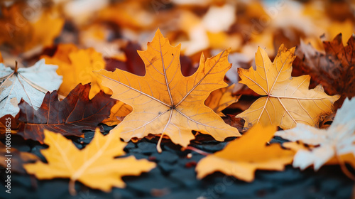 © OMD, Fototapeta premium Close-up of colorful autumn leaves on the ground with focus on vibrant yellow and orange maple leaves