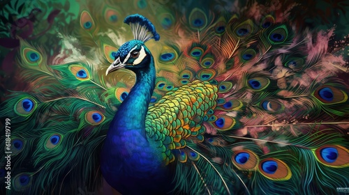 © jambulart, Fototapeta premium Close up of colorful beautiful peacock in jungle at night time with neon glow