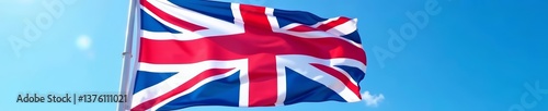 © Boonyapawn, Naklejka premium Close-up of colorful British flag fluttering against clear blue sky, Union Jack, tourism