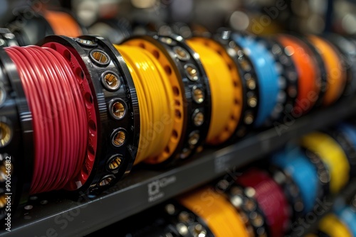 © NikahGeh, Fototapeta premium Close up of Colorful Coiled Cables on a Black Shelf