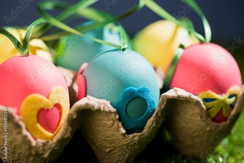© vectorfusionart, Fototapeta premium Close-up of colorful Easter eggs in crate