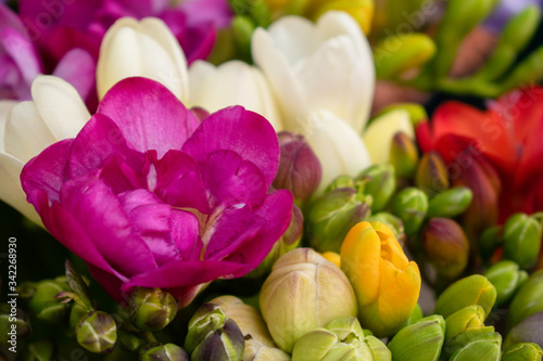 Fototapeta premium Close up of colorful Freesia in a flower shop in Sofia.