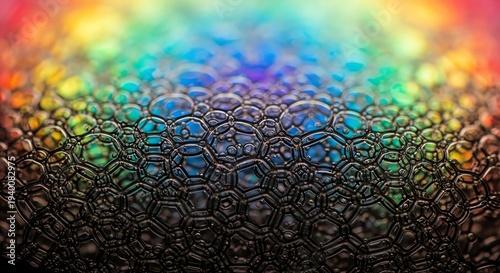 © mh, Naklejka premium Close-up of colorful iridescent bubbles with rainbow reflections and textured surface.