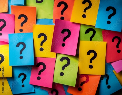 © Erik, Naklejka premium close up of colorful paper notes with question marks creating a vibrant and playful background