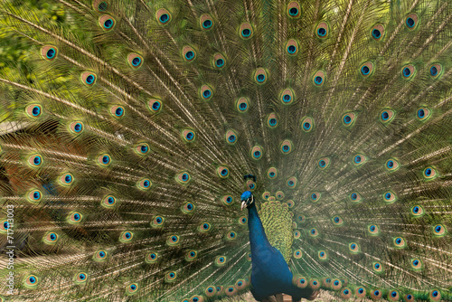 Naklejka premium Close up of colorful peacock with his feathers fanned out