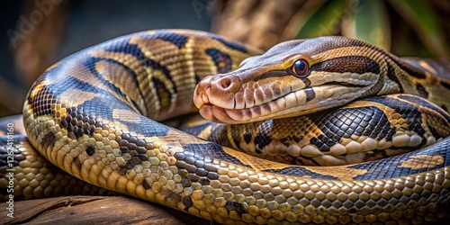 © kanda, Fototapeta premium Close-Up of Colorful Python Coiled Around Natural Habitat
