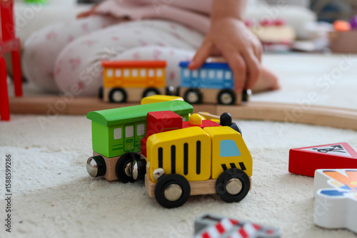 Obraz premium Close-Up of Colorful Wooden Vehicles with Child Playing in Background